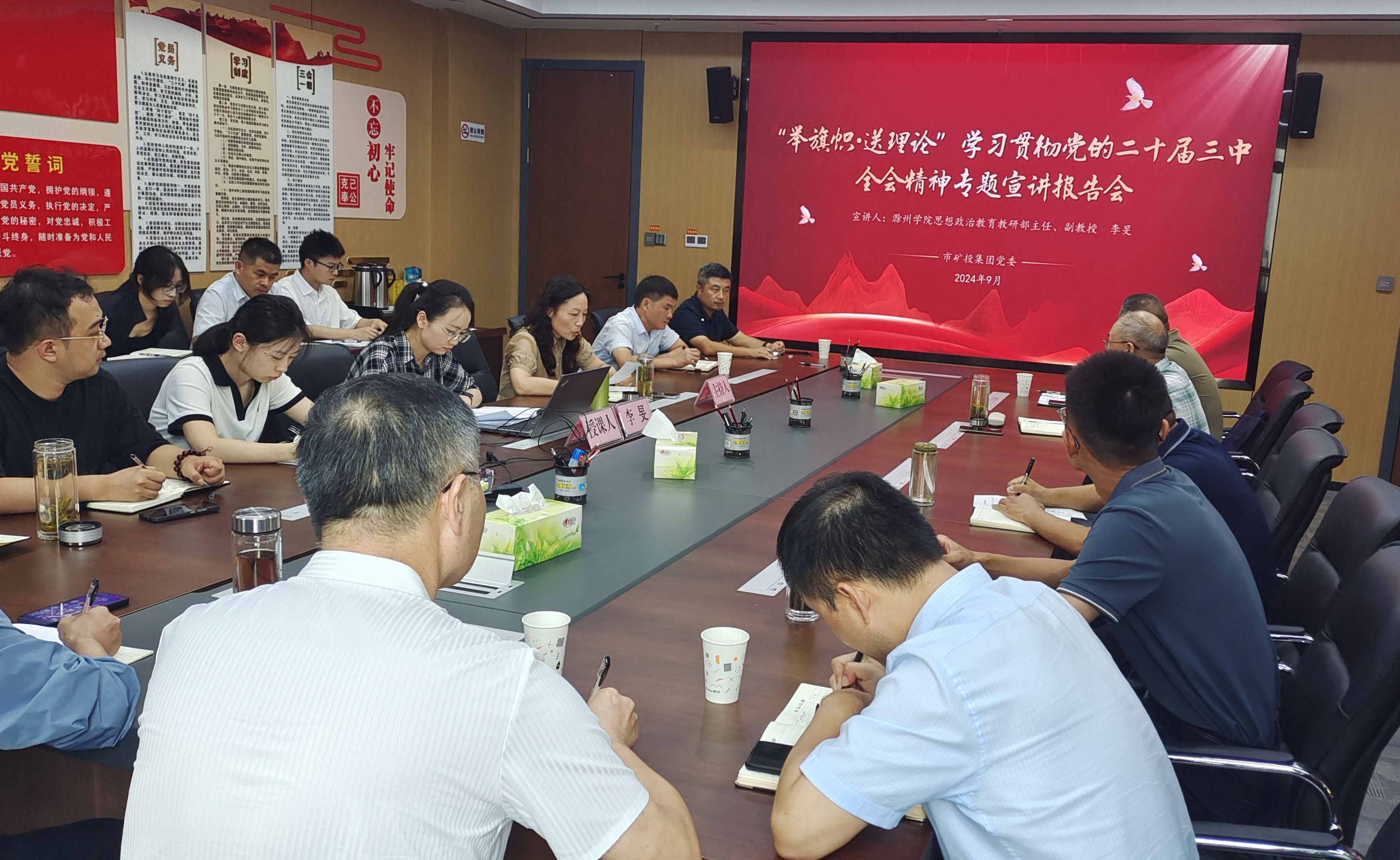 9月14日,“舉旗幟·送理論”學(xué)習(xí)貫徹黨的二十屆三中全會(huì)精神專(zhuān)題宣講活動(dòng)在市礦投集團(tuán)舉行。滁州學(xué)院思想政治教育教研部主任、副教授李旻作專(zhuān)題宣講報(bào)告。市礦投集團(tuán)本部全體干部職工、各子公司負(fù)責(zé)人參加會(huì)議。